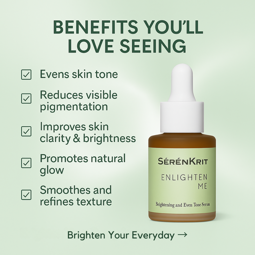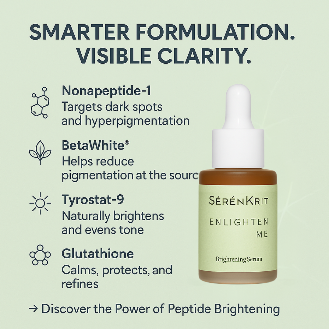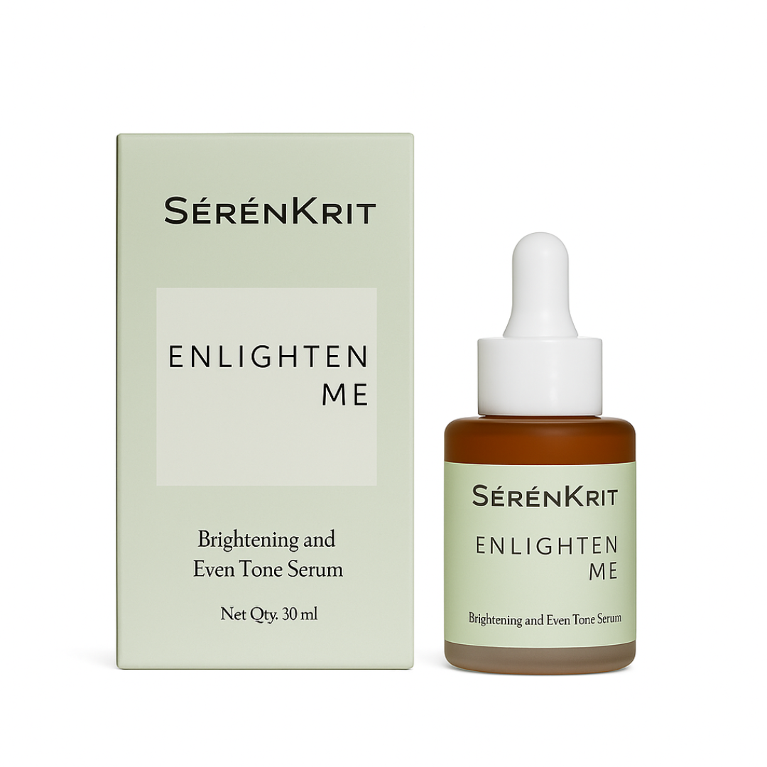 Enlighten Me is part of our Sérénkrit derma line — a clinically advanced, dermatologist-tested serum designed to address stubborn dullness, hyperpigmentation, melasma, uneven tone, and post-acne marks (PIH). Formulated with Alpha Arbutin, Tranexamic Acid, Niacinamide, Glutathione, Tyrostat™ 9, Nonapeptide-1, and Oligopeptide-68 (β-White™), it works across multiple pathways of melanogenesis to visibly fade discoloration and restore clarity — without relying on harsh exfoliating acids.