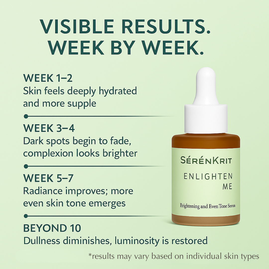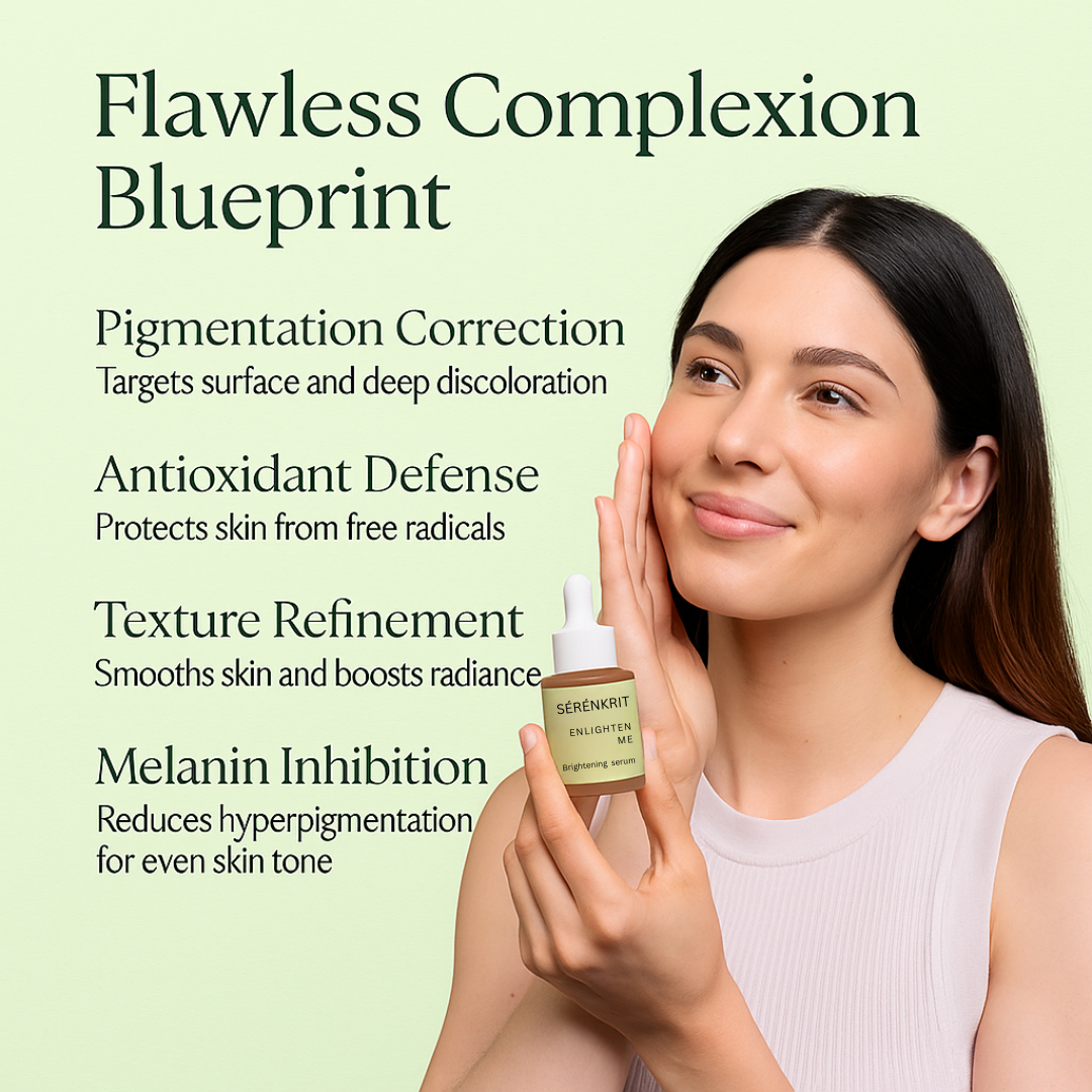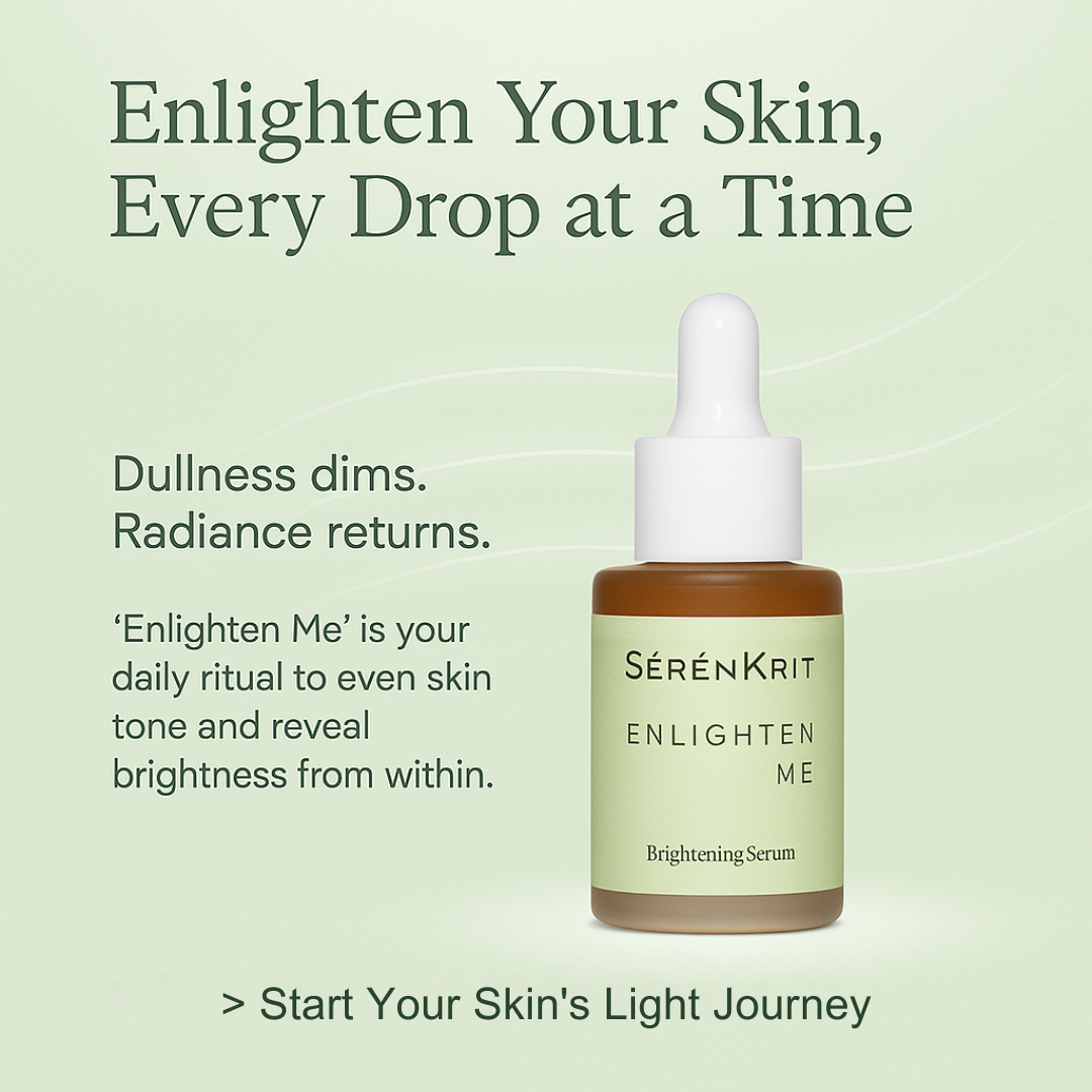 Enlighten Me is part of our Sérénkrit derma line — a clinically advanced, dermatologist-tested serum designed to address stubborn dullness, hyperpigmentation, melasma, uneven tone, and post-acne marks (PIH). Formulated with Alpha Arbutin, Tranexamic Acid, Niacinamide, Glutathione, Tyrostat™ 9, Nonapeptide-1, and Oligopeptide-68 (β-White™), it works across multiple pathways of melanogenesis to visibly fade discoloration and restore clarity — without relying on harsh exfoliating acids.
